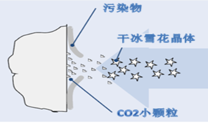 1um雪花晶體+壓縮空氣噴射到工件表面污染物脫離表面被壓縮空氣吹出表面